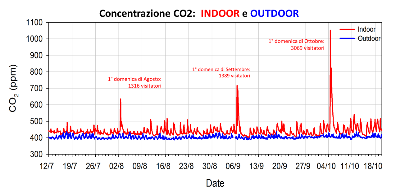 E’ possibile utilizzare misure di CO2 come tracciante per valutare l’efficacia del sistema di ventilazione museale: nelle sale l’emissione di CO2 dovuta ai visitatori ne favorisce, in presenza di una scarsa ventilazione, l’accumulo in atmosfera e la reazione sui materiali sensibili in presenza di un’adeguata umidità relativa.