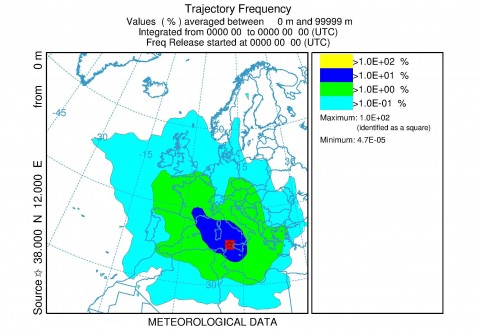 Nella Figura MA-2 è visualizzato il campo di frequenza di tutte la traiettorie calcolate, per avere una stima della provenienza delle masse d’aria in grado di influenzare le misure di composizione dell’atmosfera presso questo sito di misura.Un’analisi della circolazione atmosferica a scala sinottica su base climatologica (si veda di seguito, Figura MA-2), l’Isola di Marettimo è prevalentemente caratterizzata da una circolazione nord-occidentale.